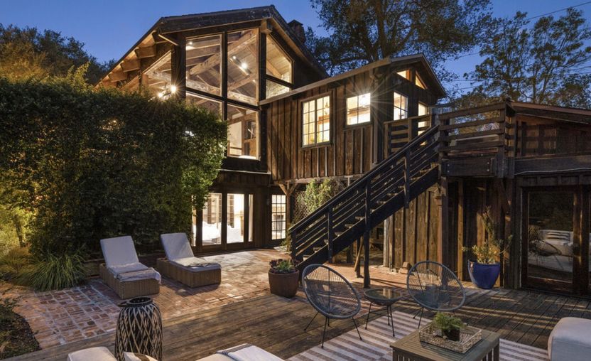 The three-bedroom, 1.5-bath mountain home has more than 2,300 square feet of living space. It comes with a studio guest cottage and children’s playhouse.